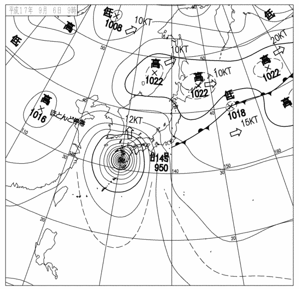 前日9時から1日経過後(9月05日)画像、2005年9月05日09JST、MTSAT-IR MET=MET+0.5=5.75, PT=5.75, T=PT+0.5=6.25, CI=T=6.25 → [97kt、 933hPa] (この1日の発達は「少しある)」と判断し、MET+0.5とした。)