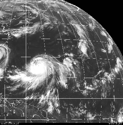 初期(台風発生1日前(8月28日))の画像、 2005年8月28日22JST、MTSAT-IR MET=PT, PT=1.0, T=PT+0.5, CI=1.5 → [29kt、1002hPa]台風発生時点(8月29日)の画像、 2005年8月29日22JST、MTSAT-IR MET=MET+1.0=2.0, PT=2.0, T=PT+0.5=2.5, CI=2.5 → [43kt、993hPa] (この1日の発達は「標準」と判断し、MET+1.0 とした。)