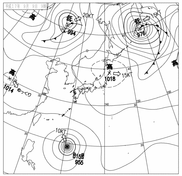 気象衛星画像及び天気図は気象庁のHPから引用させて頂きました。 本日をもって、T0515およびその後の温帯低気圧の追跡を終了します。 補足: 9月16日は、大陸からやってきた高気圧の冷気吹きだしにより気温低下あり。 館野上空200hPaでは、00Zで、−50℃以下になっており、夕方、巻層雲の上に 飛行機雲が何本も形成されていました。