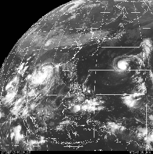 初期(台風発生の24時間前(9月25日))の画像、 2005年9月25日09JST、MTSAT-IR MET=PT=0.5 PT=0.5 T=1.5??, CI=1.5?? → [29kt、1002hPa] 本日のMET数は、台風誕生の翌日9月26日9時の値から、遡ってきて、逆算したものです。台風発生時点(9月26日)の画像、 2005年9月26日09JST、MTSAT-IR MET=1.5, PT=1.5, T=PT+0.5=2.0, CI=2.0 → [36kt、998hPa] (「中心の気圧は1000ヘクトパスカル中心付近の最大風速は18メートルで」のJMA発表値のうち、 風速にあわせるべくCI=2.0とした。これに伴い、METを逆算し、MET=1.5 とした。 MET=1.5 を更に遡って、1日前の25日9時の状態をMET=0.5と推定した。)