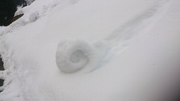 山の斜面で、木の枝などから落ちた小さな雪の塊が転げ落ちてロールケーキ状に