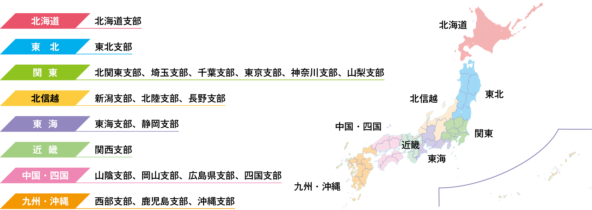 全国に広がる支部を8つの地域ブロックに分け、関係機関と連携し、地域に密着した 活動を展開しています。