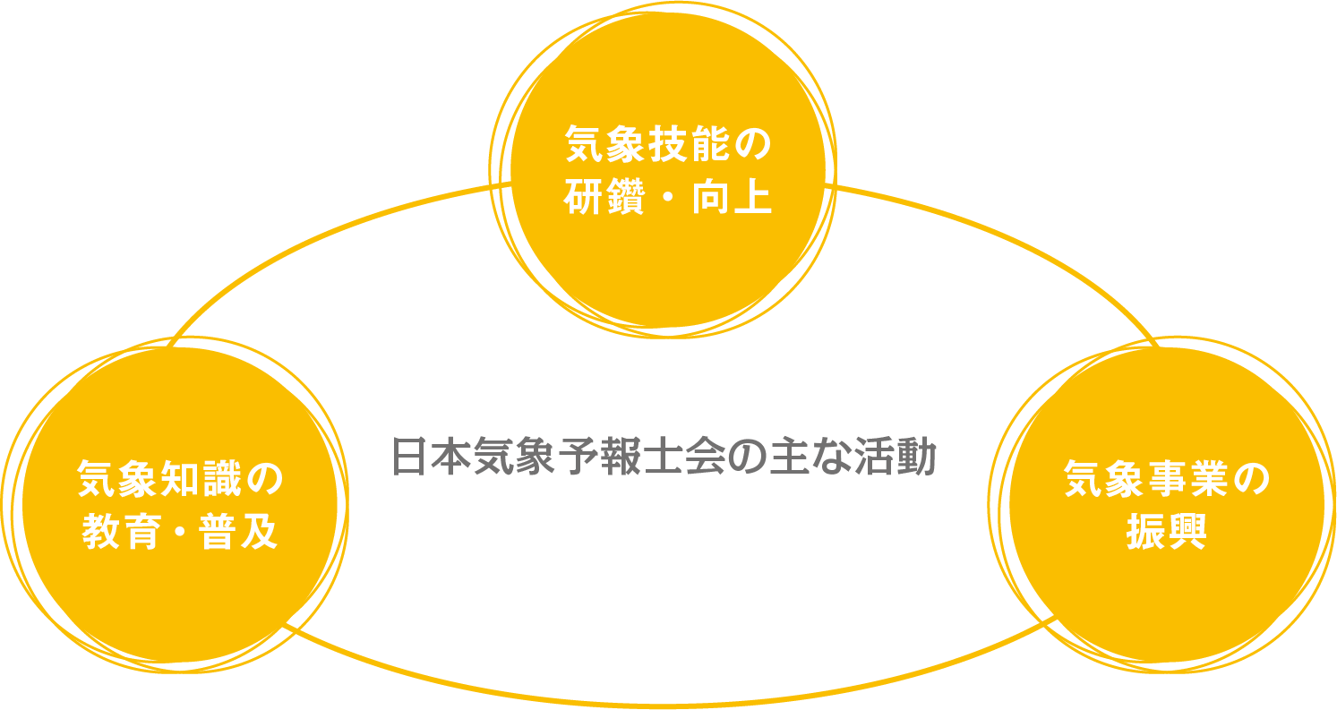 また、会員相互の交流を図り、技能講習会などで技能の研鑽・向上を図り、それを生かした社会貢献などを通じて気象予報士の社会的地位を向上させることを大きな目的として活動しています。
