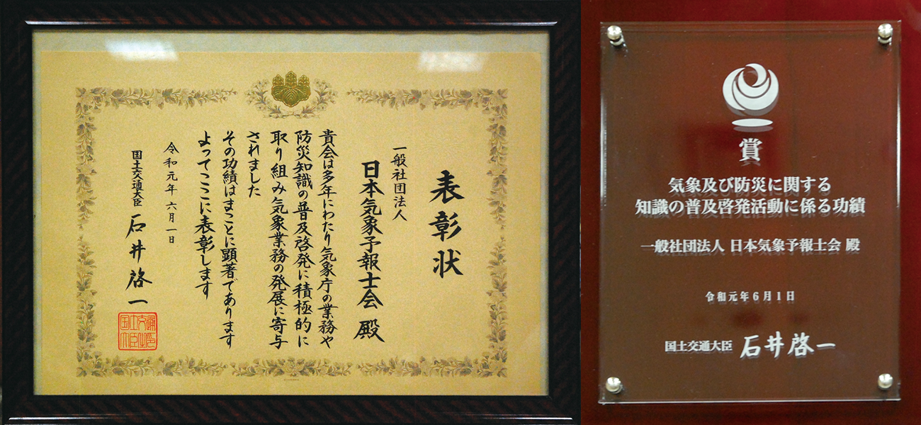令和元年の気象記念日に、多年にわたり気象庁の業務や防災知識の普及啓発に積極的に取り組み気象業務の発展に寄与した功績として表彰されました。