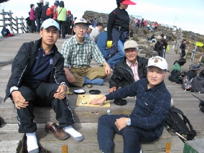 Japan and Korea IBM members including me climbed up and down Mt.Halla in Jeju island, Oct.29, 2007. It rained before dawn and was cloudy at the starting point Seongpanak, but getting good by noon. We four people bought "Kimpub" for lunch and petbottled water at the Seonpanak shop. Maple leaves were very colorful at the beginning. There were toilets, drinking water facilities and a shop selling rahmen and coffee etc on the trail to the summit. Mile stones were built by 250m increment. We started 8 o'clock and arrived at the summit 12:50. Weather was fine on the top of the Mt.Halla, stayed there one hour, enjoyed "GO" match 30 minutes, left there by 2 pm due to regulation, took Gwaneumsa course and arrived at Gwaneumsa 6 past 23 min. It took 10 hours and 23 minutes from Seonpanak to Gwaneumsa including resting time. It was a little bit hard walking for me, but enjoyable. We took two courses below, ** Seongpanak Course(9.6Km, Altitude 750m-->1950m for Ascending), ** Gwaneumsa Course(8.7Km, Altitude 1950m-->560m for Descending). |