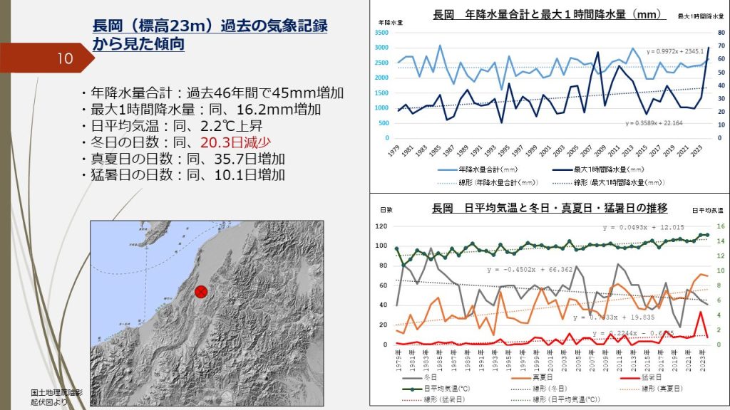 今後大きなイベントが無ければこれらの傾向が続く可能性が高く、様々な「異常」で「極端」な気象が増える可能性があると思う。その一方で温暖化は雪害の減少や食料確保などプラスに働く場合もあり、温暖化が必ずしもマイナス面だけでない事も考慮するする必要があると思います。そのほかトピックスとして、いわゆる「佐渡ブロック」の話題と長岡と大変ゆかりの深い「カマキリの雪予想」の顛末及びハザードマップ活用のススメなど幅広く話した次第です。